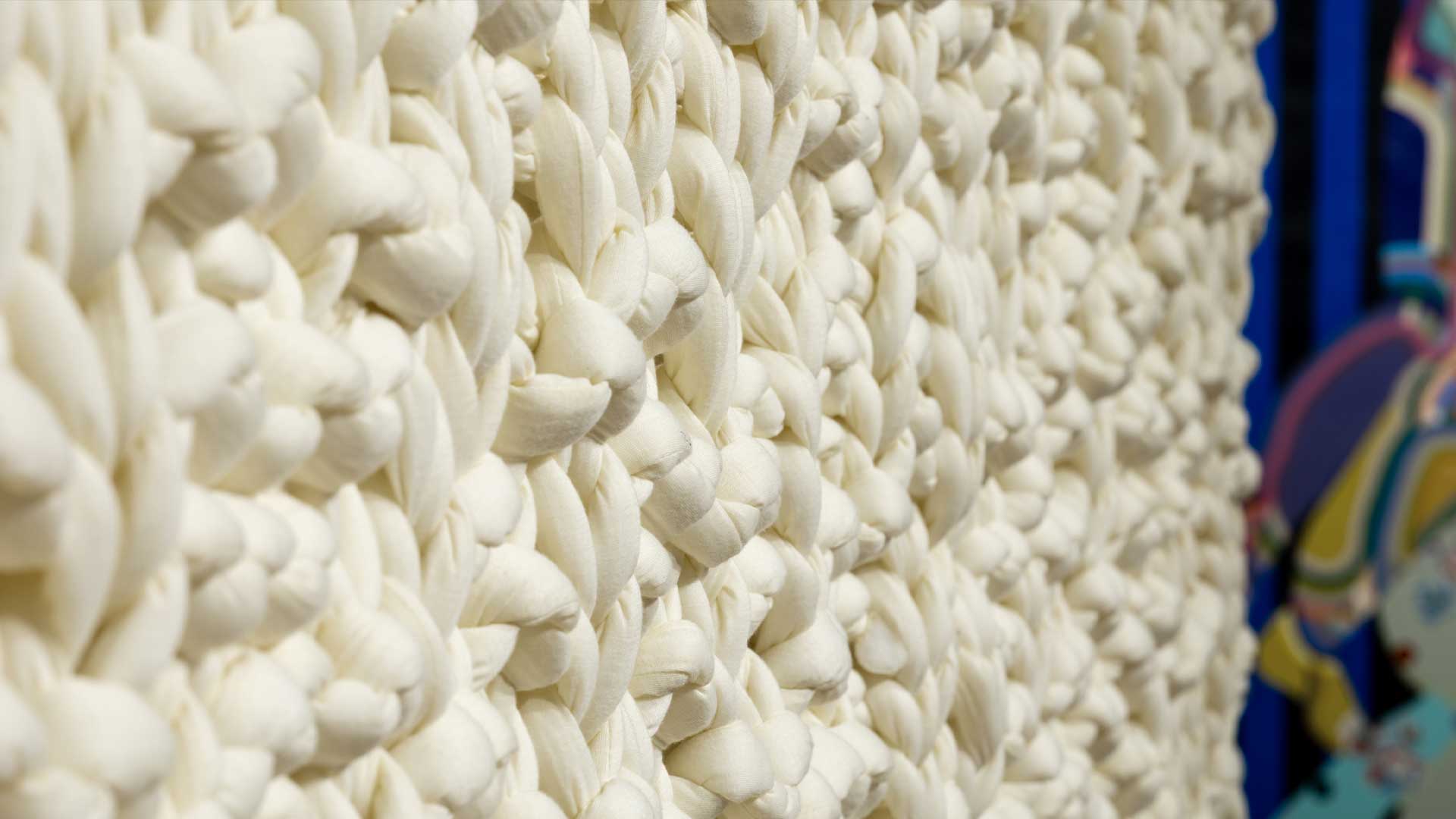 I am currently in production for my first Los Angeles based solo show at Studio 203. This art exhibition, titled “Non-Binary Code,” is an exploration of gender identity, textile-based practices, and coded meaning. The exhibition will consist of several large scale knitted wall-hangings, along with an interactive installation. To make this work, playing with the binary nature of the knit/purl stitchwork inherent to knitting, I translated the word “nonbinary” into binary code. I then knit this label of my gender identity into textile wall hangings and an interactive lounge area, both imbuing and obscuring meaning of the word “non-binary”, much in the way binaries of gender, and the desire to transcend these binaries, are coded into the concept of non-binary identity. The textile lounge installation invites viewers to come rest, mingle, or meditate on hidden meanings of gender expression and identity that we often take for granted. The choice of medium—acrylic (yarn) on canvas—brings the work in dialogue with the history of white paintings in minimalist abstraction. The use of binary code also has an especially poignant connection to the history of textile production, when the jacquard loom and punch card knitting were both used to develop the first computer languages. I see this work as a queering of many supposedly binary hierarchies, complicating and challenging distinctions of art & craft, digital & handmade, male & female. It’s social impact functions in several ways: to make non-binary and gender-nonconforming people feel seen, to educate cis folks on gender beyond the binary, and to facilitate conversation about these ideas amongst the viewers.